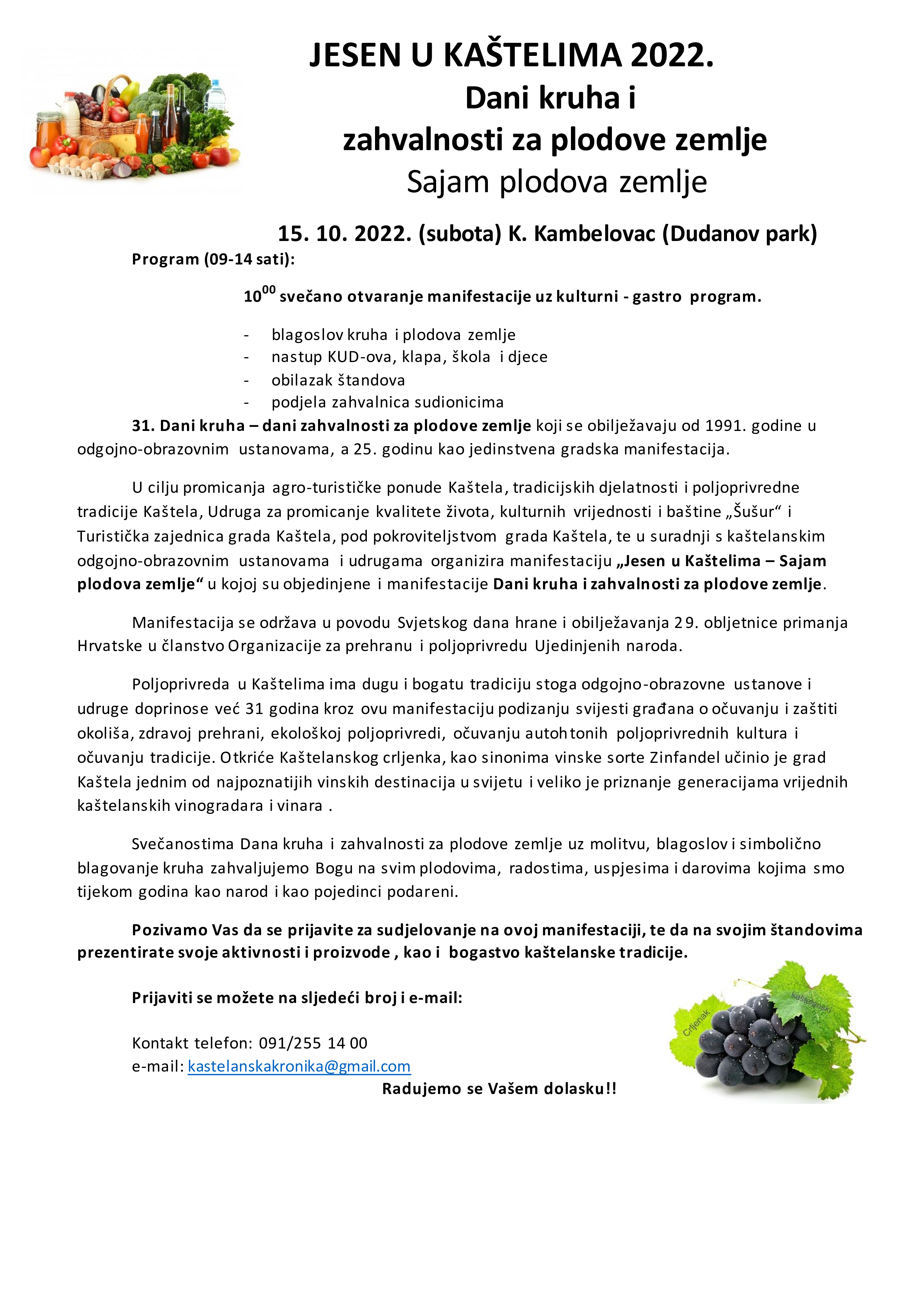 Pozivamo Vas da se prijavite za sudjelovanje na ovoj manifestaciji, te da na svojim štandovima prezentirate svoje aktivnosti i proizvode , kao i bogastvo kaštelanske tradicije.